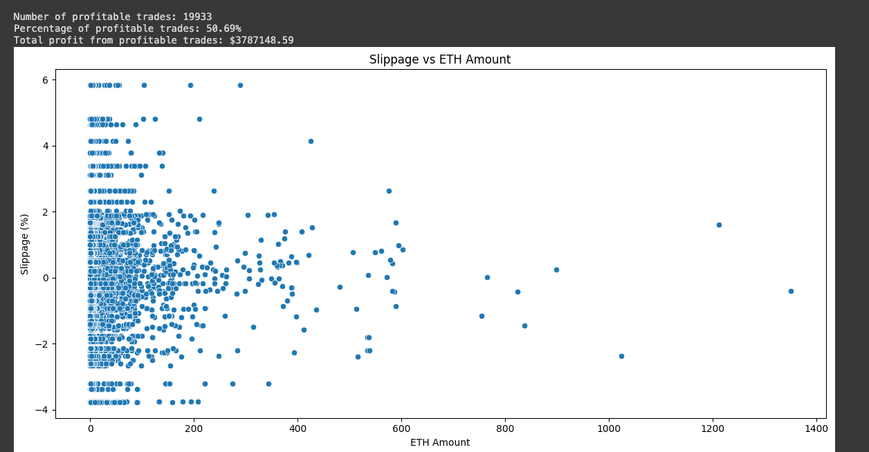 The scatter plot reveals a concentration of trades with lower ETH amounts and relatively low slippage. However, there’s a noticeable trend of increased slippage variability as the ETH amount increases. This suggests that larger trades are more likely to experience higher slippage, which could contribute to greater LVR in these instances.