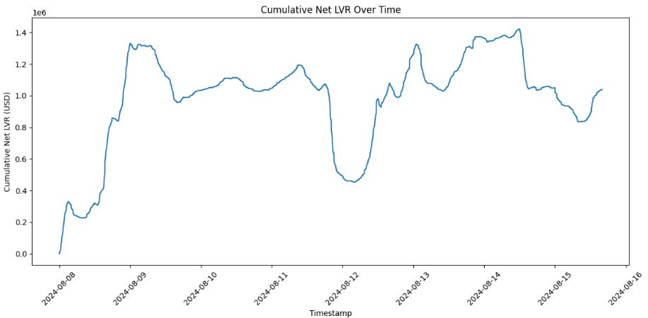 While we calculate LVR on a per-trade basis, the cumulative LVR over time provides crucial insights into the overall impact on LPs. By summing the net LVR across all trades in our study period, we obtain a measure of the total opportunity cost faced by LPs:
