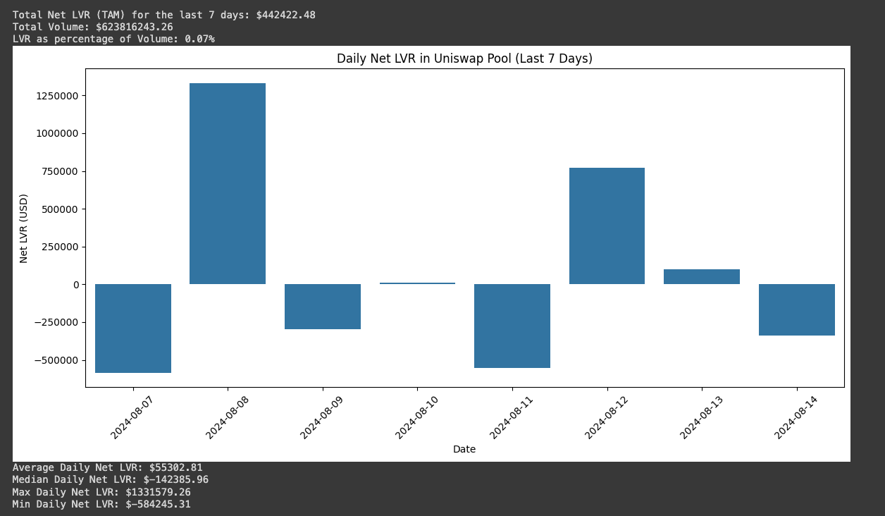 Our analysis of the Uniswap pool over a seven-day period revealed significant insights into the dynamics of LVR. The total Net LVR, which represents the TAM for this period in this pool, amounted to $1,039,002.48. LVR constituted 0.18% of the total volume of the pool.